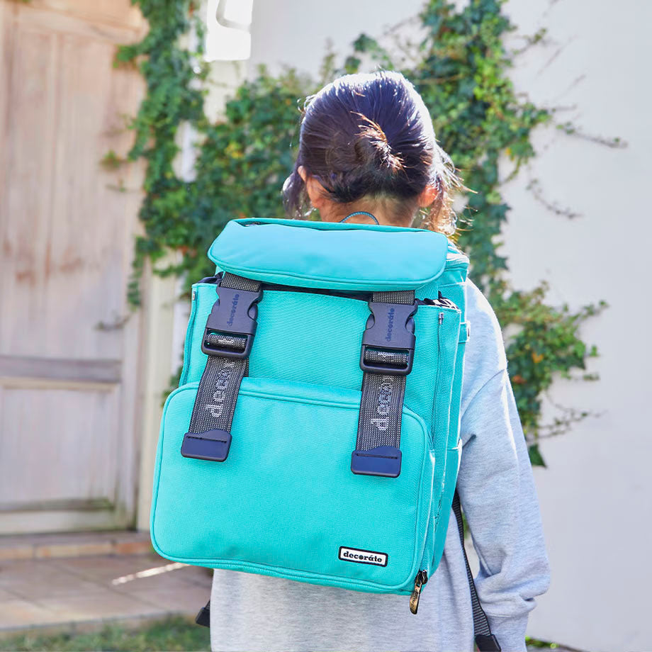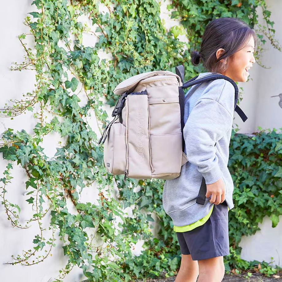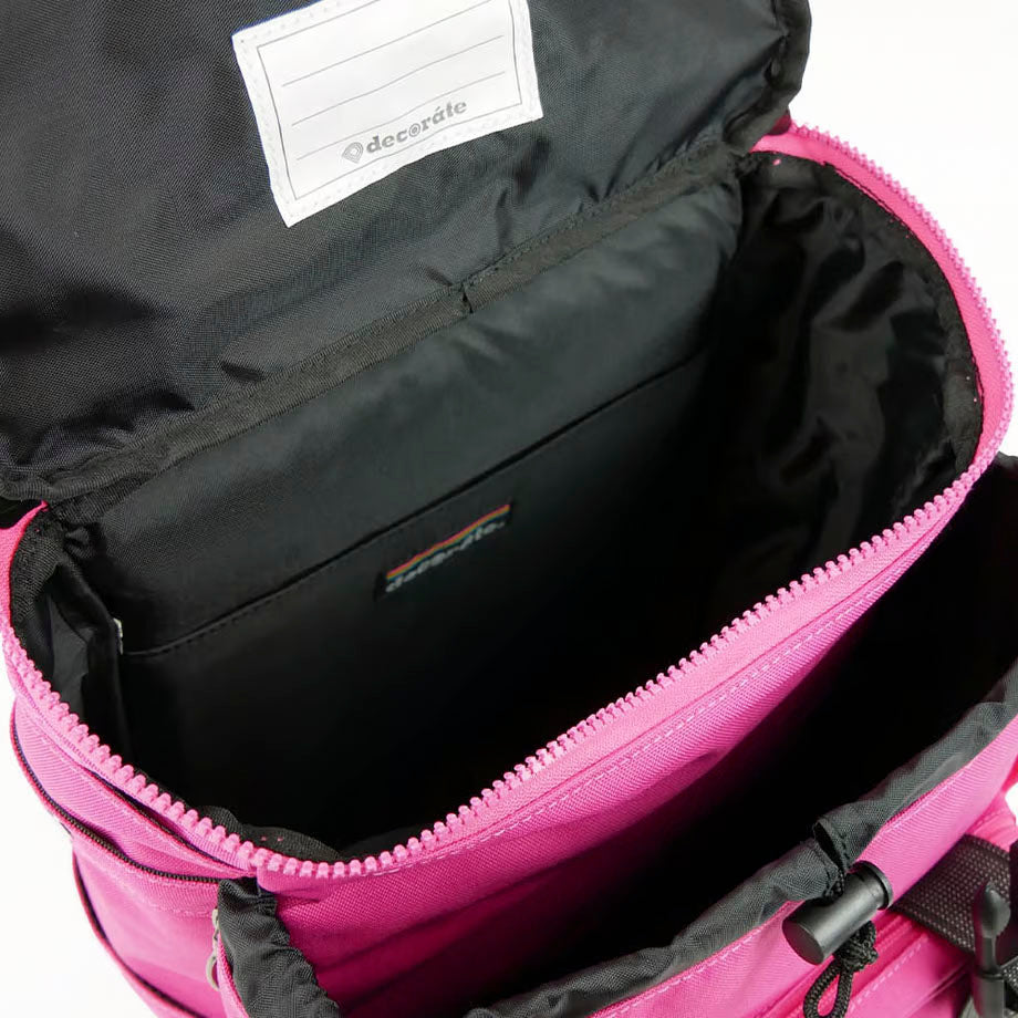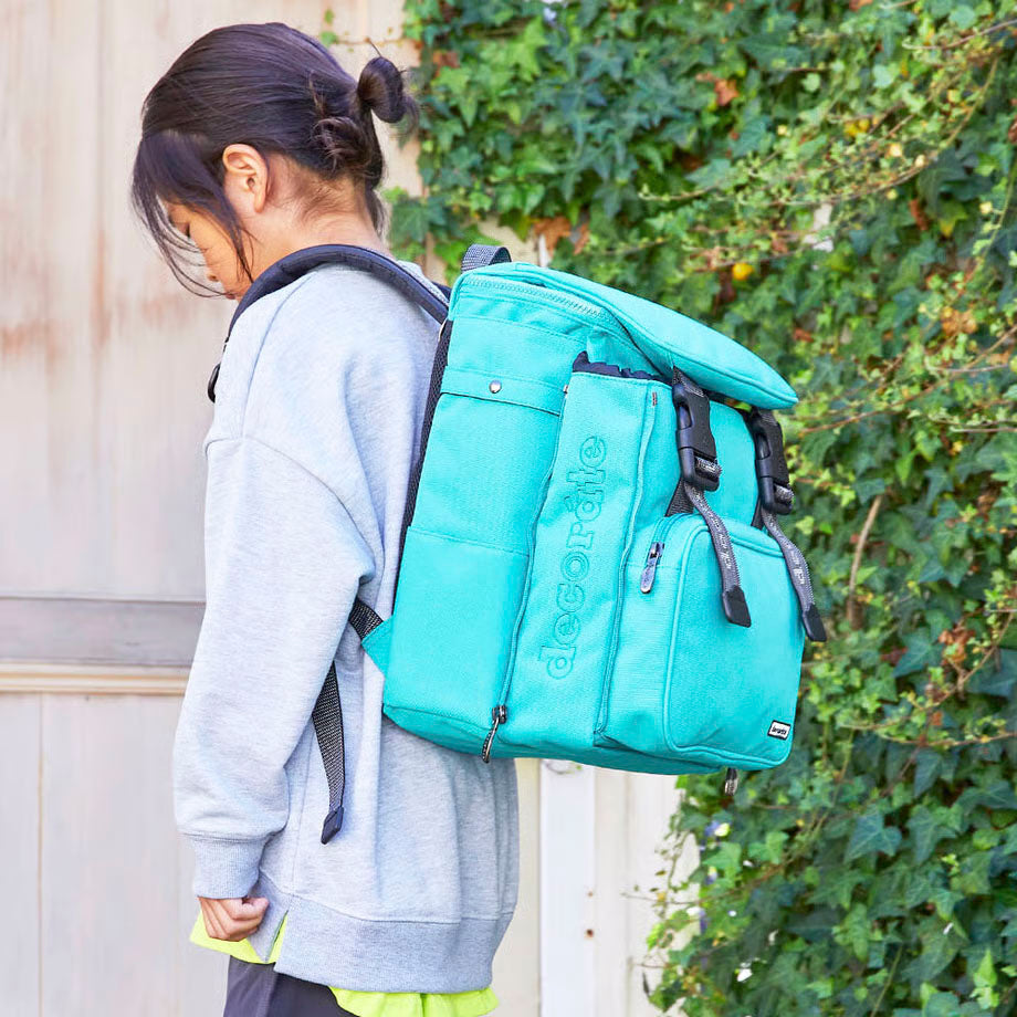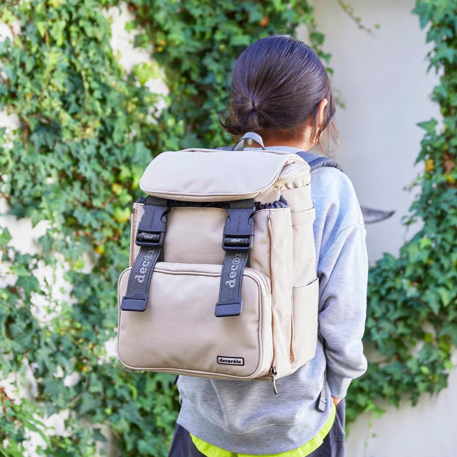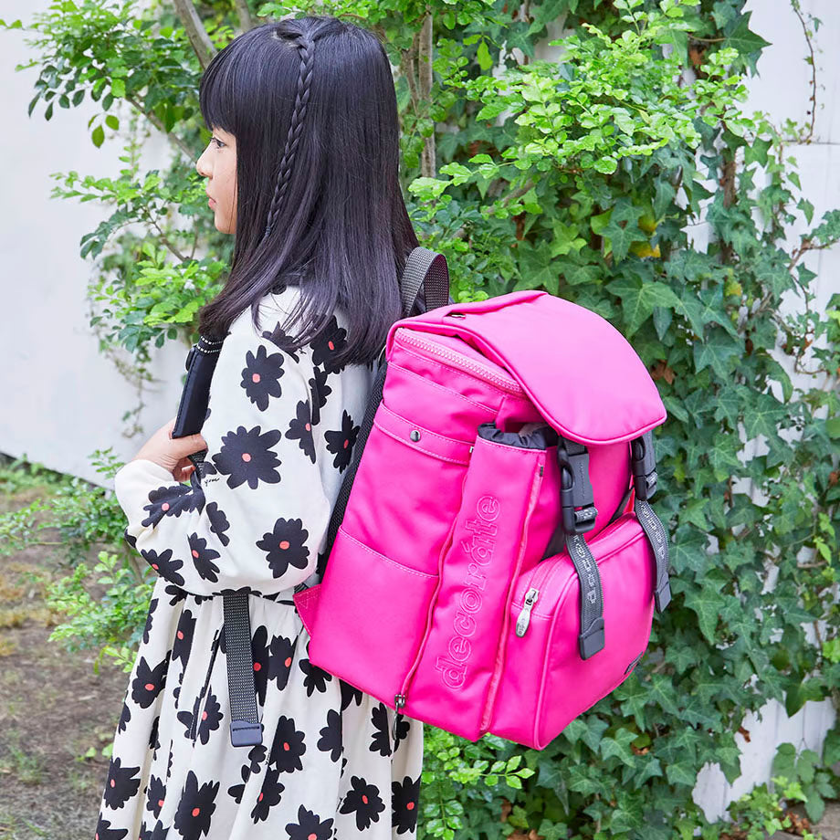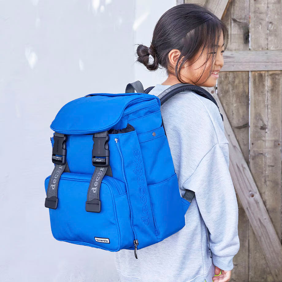 【いろんなシーンに対応する高い機能性】 ファスナー付きポケットを備えたフラップをめくると、ファスナーで開け閉めできるメインコンパートメントが。少し大きめのリングが付いたこのファスナー、弱い力でもスムーズに動くので、まだ小さなお子様でも安心して使うことができます。 メインコンパートメント内には、タブレットスリーブを標準装備。そしてそれ以外にはあえてポケットなどを設けず、シンプルな箱型にデザインしているので、必要な荷物をどんどん詰め込めます。 そんなメインコンパートメントの外側には、両サイドにファスナーを備えたサブコンパートメントが。こちらはファスナーでコンパートメントの奥行きを詰めたり広げたりできるので、荷物が少ないときにはコンパクトなシルエットで使うことが可能です。 フラップや本体外側には、ファスナー付きのポケットを備えているので、失くしてしまいがちな小物は仕分けて収納できます。 また、メインフラップには収納式のレインカバーを内蔵。ファスナーから引き出してそのまますっぽりと全体に被せるだけなので、急な荒天でも安心です。 そのほか、少し厚みを持たせてクッション性を高めたショルダーベルトや背面パッドで、子どもの小さな肩や背中への負担を少なくする工夫も。 できるだけ多くのお子様に、いろんなシーンで快適に使ってほしい。 decorateのバックパックには、そんな思いと機能性を盛り込んでいます。