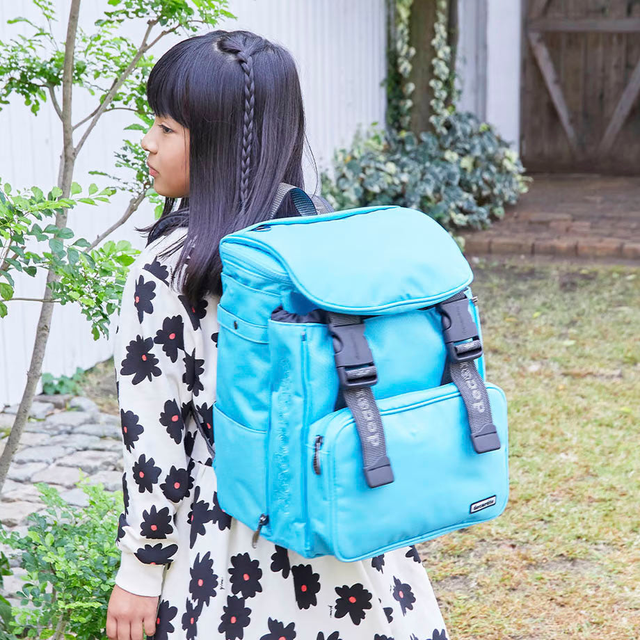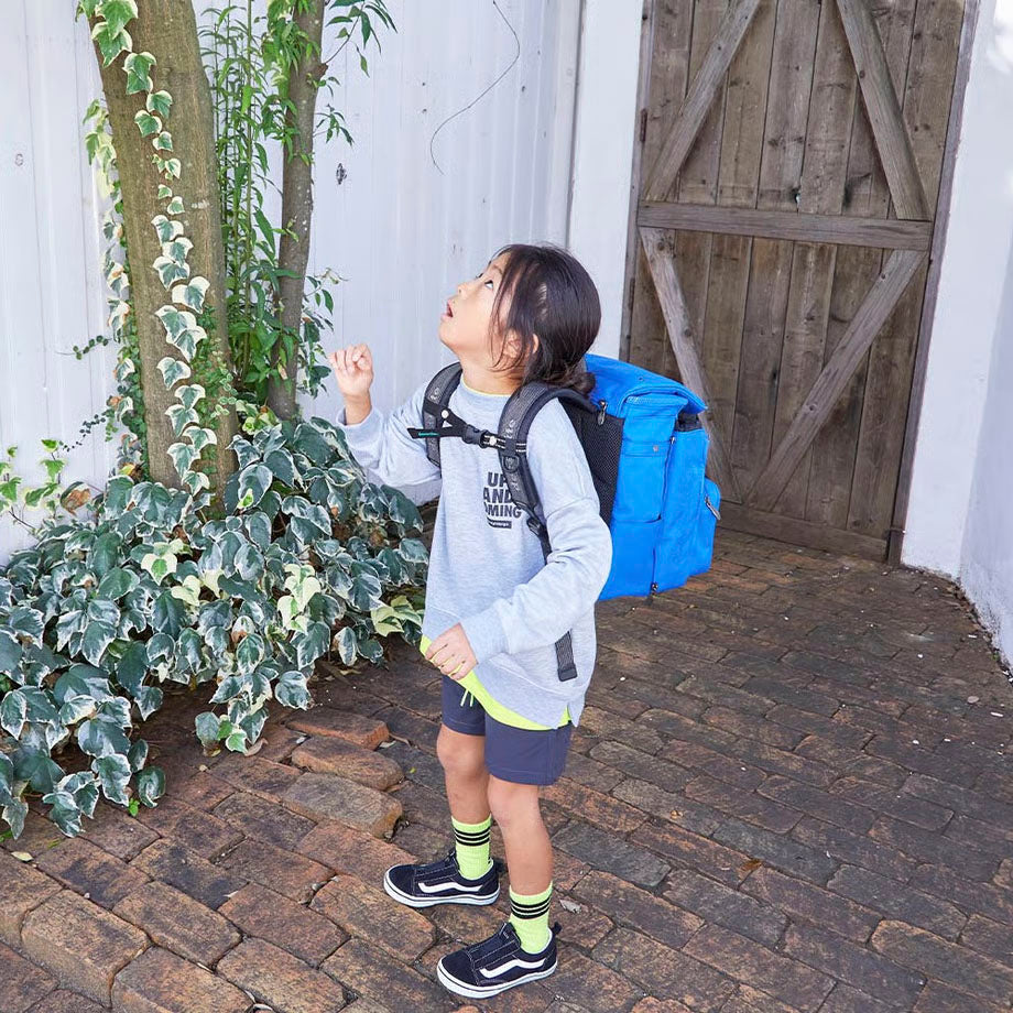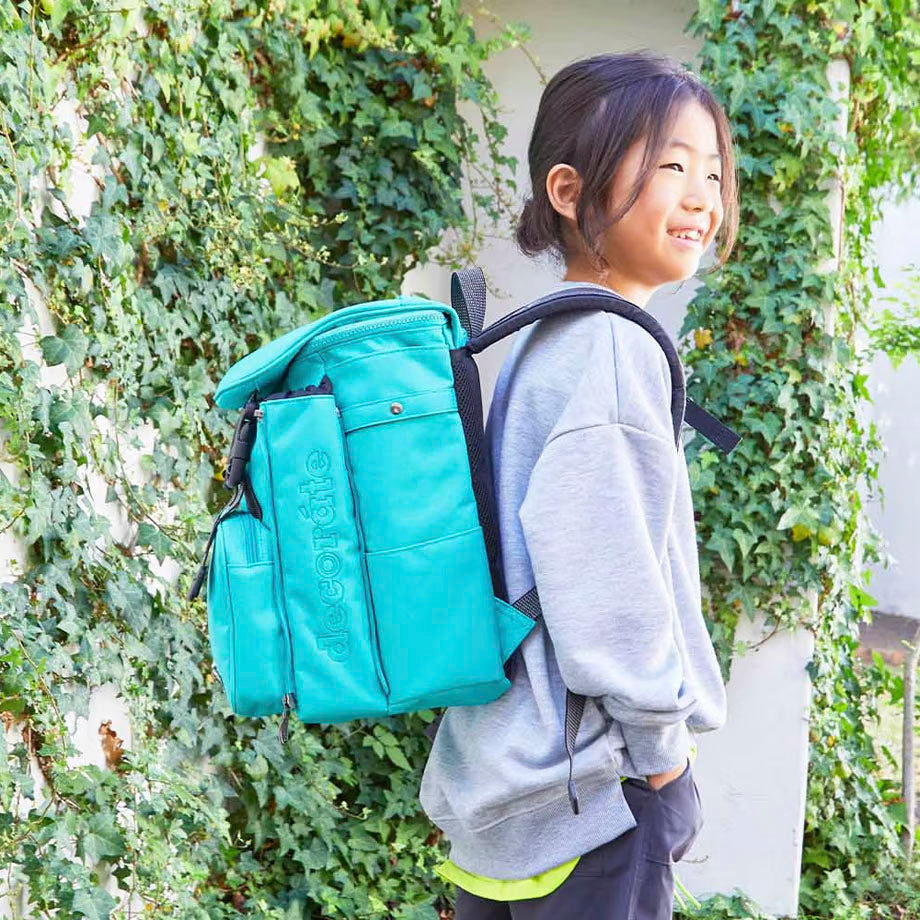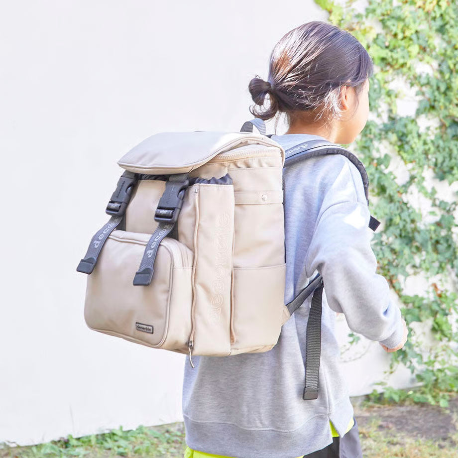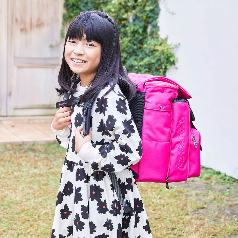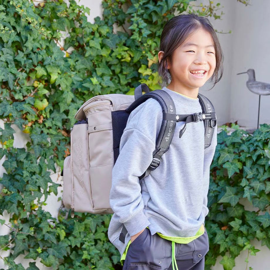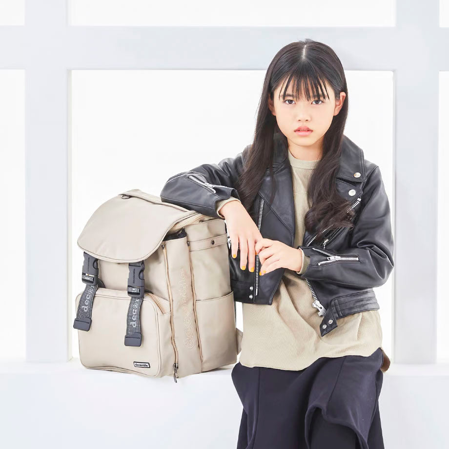 【いろんなシーンに対応する高い機能性】 ファスナー付きポケットを備えたフラップをめくると、ファスナーで開け閉めできるメインコンパートメントが。少し大きめのリングが付いたこのファスナー、弱い力でもスムーズに動くので、まだ小さなお子様でも安心して使うことができます。 メインコンパートメント内には、タブレットスリーブを標準装備。そしてそれ以外にはあえてポケットなどを設けず、シンプルな箱型にデザインしているので、必要な荷物をどんどん詰め込めます。 そんなメインコンパートメントの外側には、両サイドにファスナーを備えたサブコンパートメントが。こちらはファスナーでコンパートメントの奥行きを詰めたり広げたりできるので、荷物が少ないときにはコンパクトなシルエットで使うことが可能です。 フラップや本体外側には、ファスナー付きのポケットを備えているので、失くしてしまいがちな小物は仕分けて収納できます。 また、メインフラップには収納式のレインカバーを内蔵。ファスナーから引き出してそのまますっぽりと全体に被せるだけなので、急な荒天でも安心です。 そのほか、少し厚みを持たせてクッション性を高めたショルダーベルトや背面パッドで、子どもの小さな肩や背中への負担を少なくする工夫も。 できるだけ多くのお子様に、いろんなシーンで快適に使ってほしい。 decorateのバックパックには、そんな思いと機能性を盛り込んでいます。