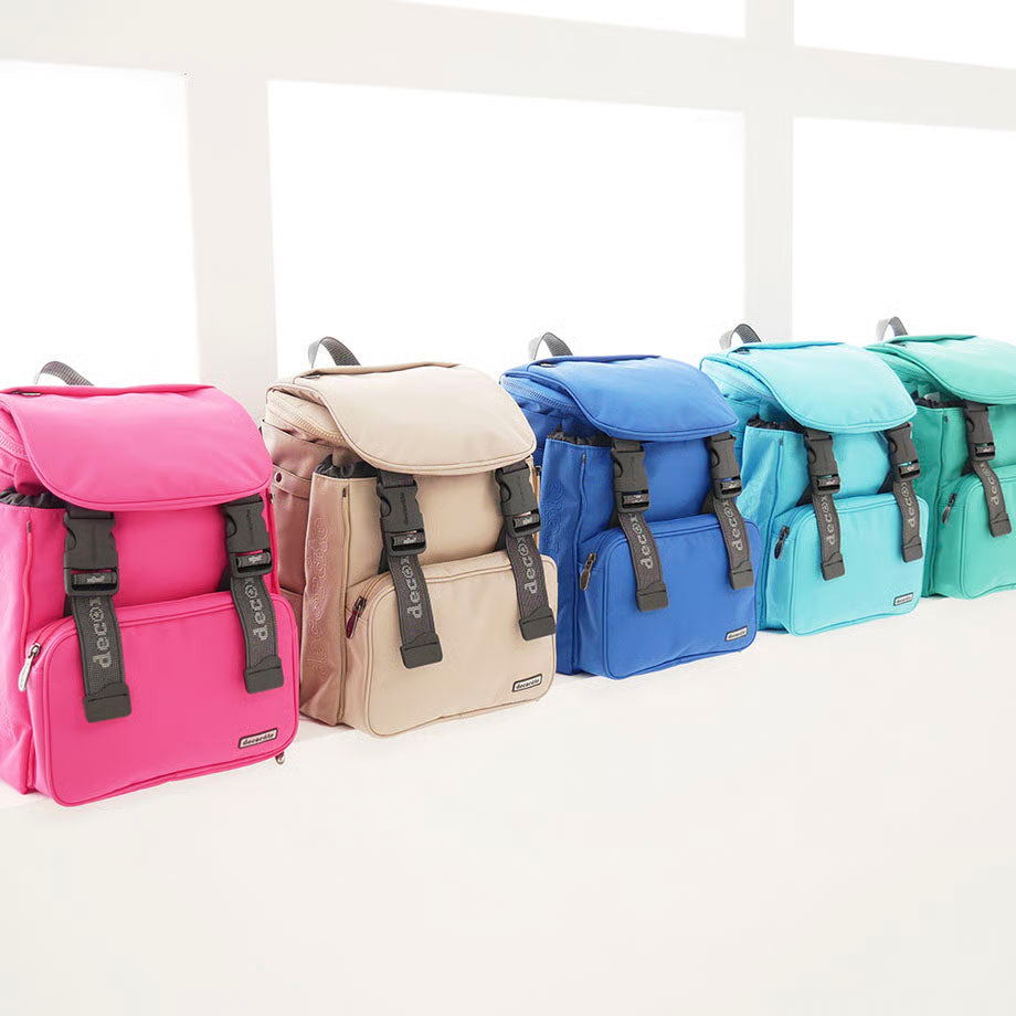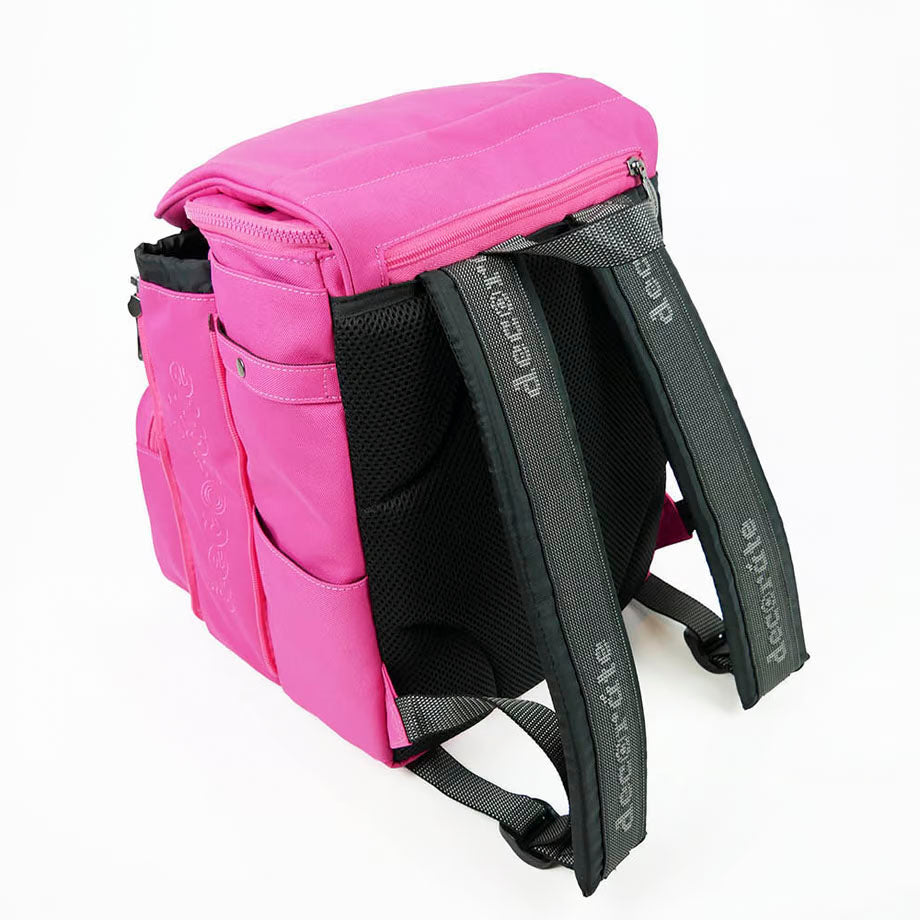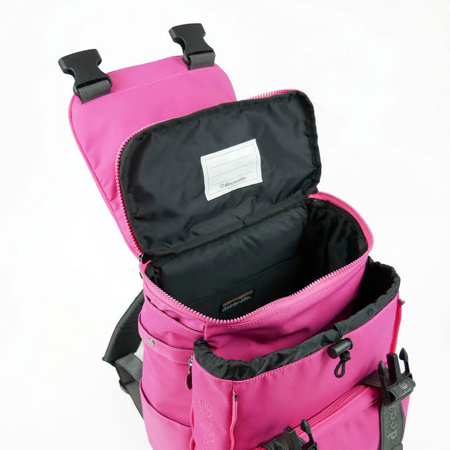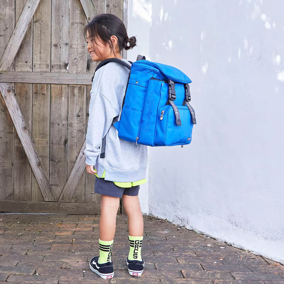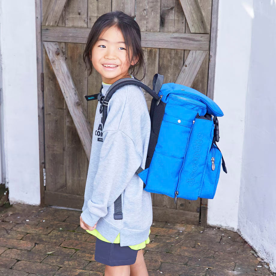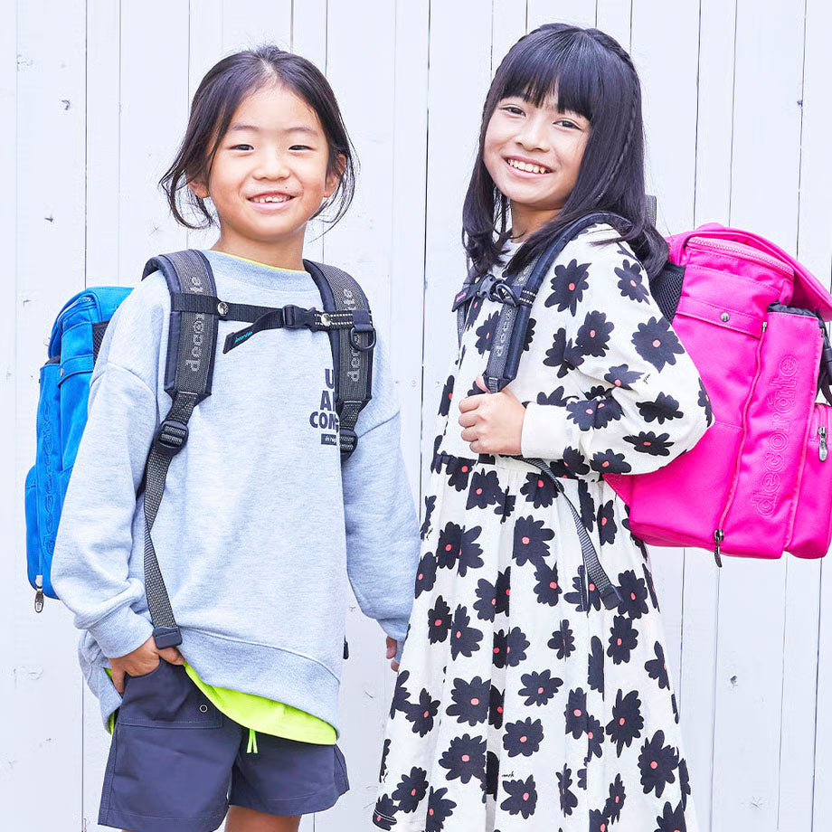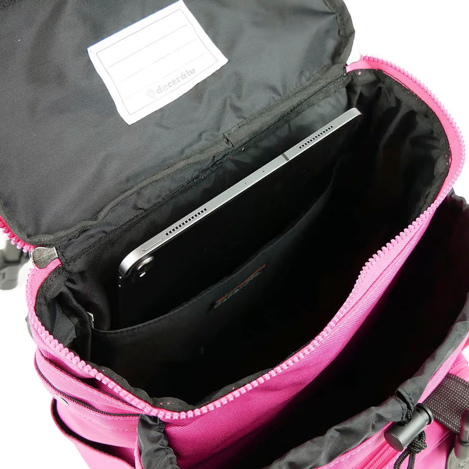 【いろんなシーンに対応する高い機能性】 ファスナー付きポケットを備えたフラップをめくると、ファスナーで開け閉めできるメインコンパートメントが。少し大きめのリングが付いたこのファスナー、弱い力でもスムーズに動くので、まだ小さなお子様でも安心して使うことができます。 メインコンパートメント内には、タブレットスリーブを標準装備。そしてそれ以外にはあえてポケットなどを設けず、シンプルな箱型にデザインしているので、必要な荷物をどんどん詰め込めます。 そんなメインコンパートメントの外側には、両サイドにファスナーを備えたサブコンパートメントが。こちらはファスナーでコンパートメントの奥行きを詰めたり広げたりできるので、荷物が少ないときにはコンパクトなシルエットで使うことが可能です。 フラップや本体外側には、ファスナー付きのポケットを備えているので、失くしてしまいがちな小物は仕分けて収納できます。 また、メインフラップには収納式のレインカバーを内蔵。ファスナーから引き出してそのまますっぽりと全体に被せるだけなので、急な荒天でも安心です。 そのほか、少し厚みを持たせてクッション性を高めたショルダーベルトや背面パッドで、子どもの小さな肩や背中への負担を少なくする工夫も。 できるだけ多くのお子様に、いろんなシーンで快適に使ってほしい。 decorateのバックパックには、そんな思いと機能性を盛り込んでいます。