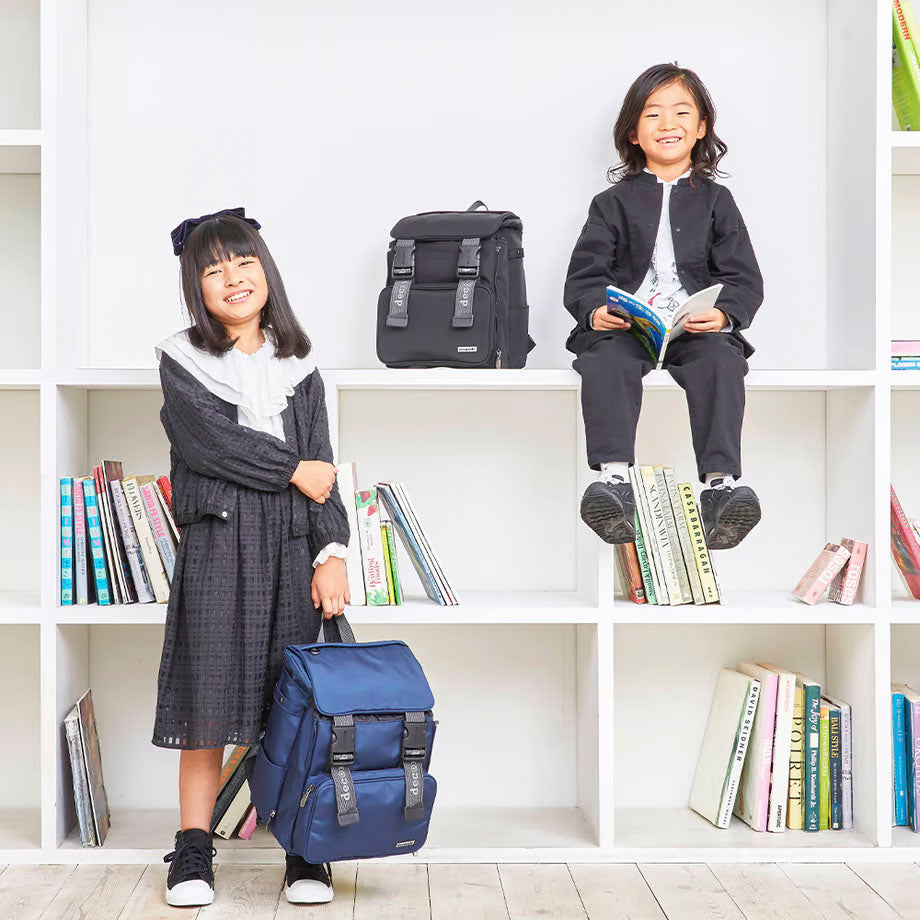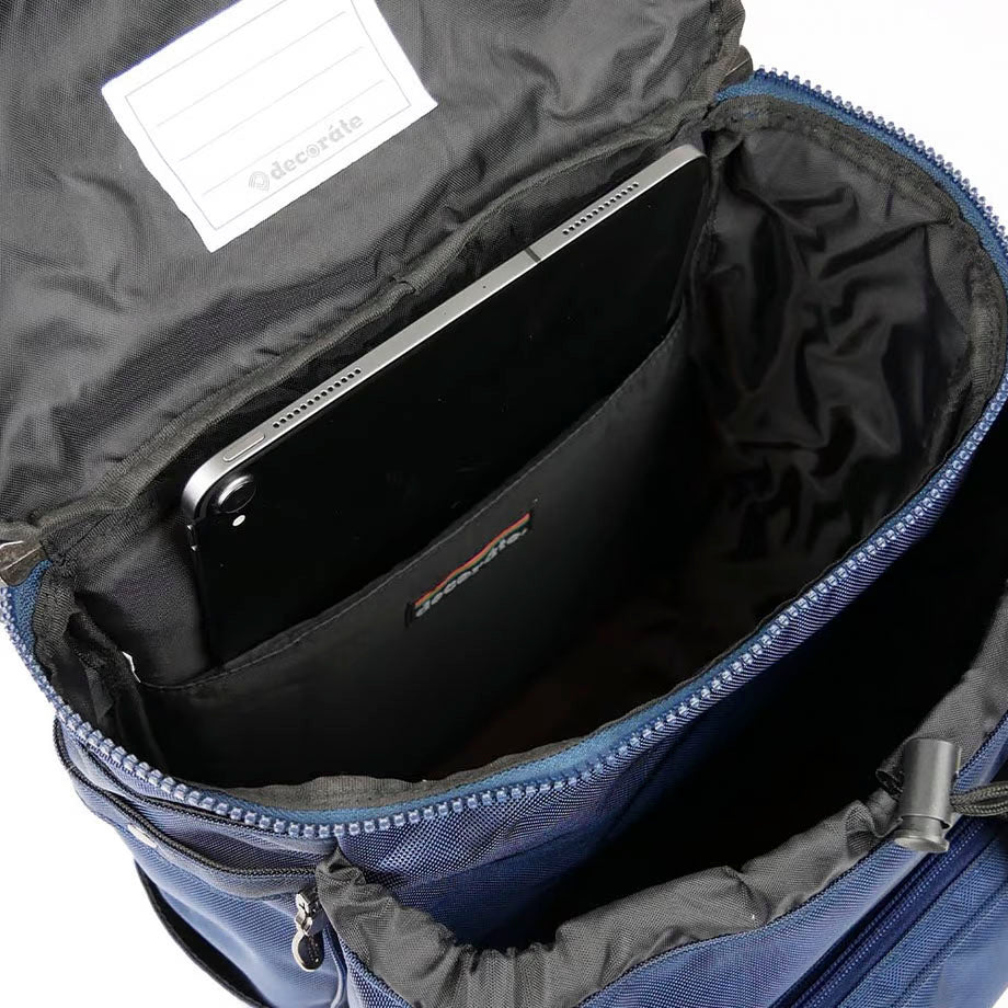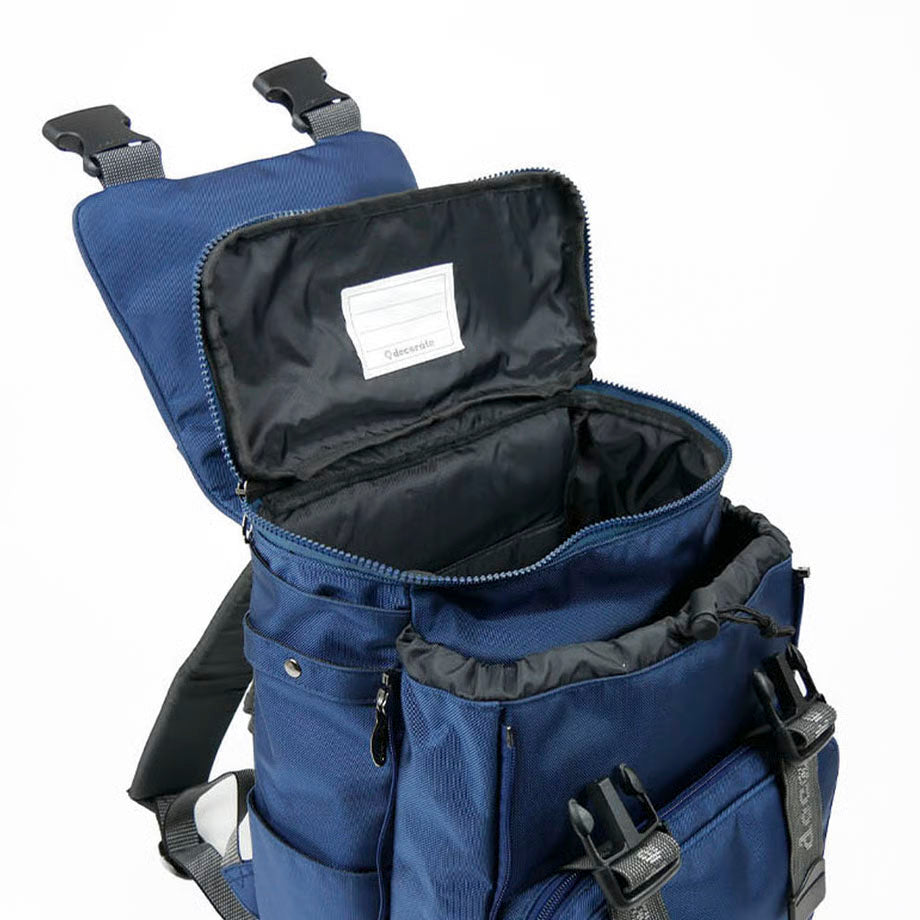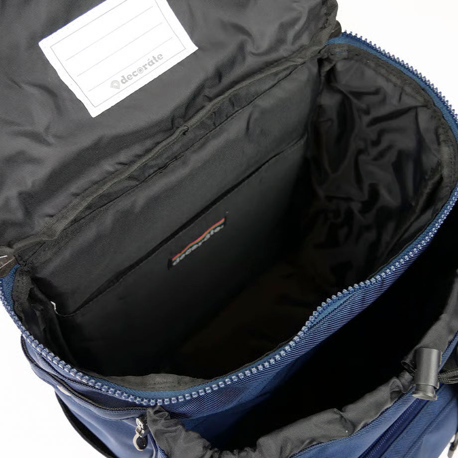 【通学にもカジュアルにも対応するネイビーカラー】 カジュアルにも、フォーマルにも、どんなシーンにも対応するネイビーカラーを採用した、decorate定番デザインのモデル[Lurie]。 清潔感も感じさせるカラー、そしてブラックカラーとはまた違う存在感のあるカラーなので、通学・通塾のバッグとしてオススメ。 そしてもちろん、カジュアルシーンにもマッチするのがネイビーカラーの魅力。オン・オフを問わずいろんなシーンで活躍してくれるモデルです。 【いろんなシーンに対応する高い機能性】 ファスナー付きポケットを備えたフラップをめくると、ファスナーで開け閉めできるメインコンパートメントが。少し大きめのリングが付いたこのファスナー、弱い力でもスムーズに動くので、まだ小さなお子様でも安心して使うことができます。 メインコンパートメント内には、タブレットスリーブを標準装備。そしてそれ以外にはあえてポケットなどを設けず、シンプルな箱型にデザインしているので、必要な荷物をどんどん詰め込めます。 そんなメインコンパートメントの外側には、両サイドにファスナーを備えたサブコンパートメントが。こちらはファスナーでコンパートメントの奥行きを詰めたり広げたりできるので、荷物が少ないときにはコンパクトなシルエットで使うことが可能です。 フラップや本体外側には、ファスナー付きのポケットを備えているので、失くしてしまいがちな小物は仕分けて収納できます。 また、メインフラップには収納式のレインカバーを内蔵。ファスナーから引き出してそのまますっぽりと全体に被せるだけなので、急な荒天でも安心です。 そのほか、少し厚みを持たせてクッション性を高めたショルダーベルトや背面パッドで、子どもの小さな肩や背中への負担を少なくする工夫も。 できるだけ多くのお子様に、いろんなシーンで快適に使ってほしい。 decorateのバックパックには、そんな思いと機能性を盛り込んでいます。