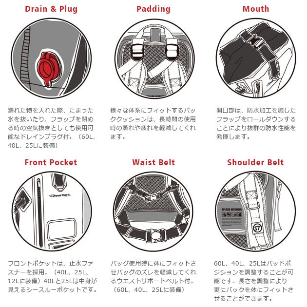 DRY TANK D2 25Lは普段使いはもちろん、ちょっとした旅行やレジャーに最適なサイズです。女性にも人気のサイズのデイパックです。DRY TANK D2シリーズは抜群の防水性能を誇るストリームトレイルのベーシックなバックパックです。防水バッグに使用されている表面素材の《ターポリン》は、ポリエステル系の繊維を合成樹脂フィルムではさんで溶着したものです。テントやよく街で目にする屋外広告の横断幕、工事現場などでも使われており、水に強く、過酷な状況下でも裂けたりしにくく、摩擦にも強い生地となっています。水の入りやすい開口部は、防水加工を施したフラップをロールダウンすることにより抜群の防水性能を発揮するとともに、ロールしやすい柔らかい生地を採用しています。多少の汚れでも簡単に拭き取ることができるため、手入れもしやすいため、フィールドにもタウンにも使用いただけます。濡れたものを収納しても内部にたまった水はドレインプラグから排出可能です。